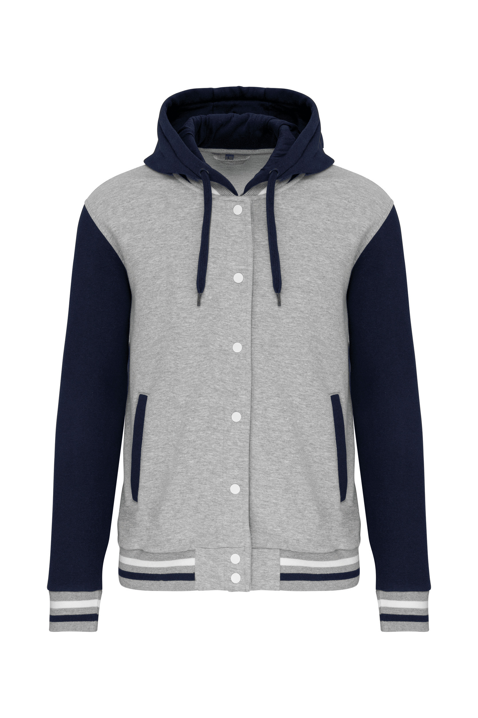70% bomuld / 30% polyester. 3-trådet børstet fleece. Kontrasterede indsatte ærmer. Hætte med 3 paneler, jerseyfor og kontrastsnore. Lukning foran med trykknapper. Ribbet med kontraststriber ved halsudskæring, ærmer og bunden af tøjet. 2 paspolerede lommer foran. Sømbånd og twill-ophængning på indersiden af halsen. Intet mærkemærke på halsen, kun et størrelsesmærke for nem tilpasning. Baseballspilleren er et sandt ikon, hun krydser gange. Det ses overalt: på gaden, i skoler og endda på den røde løber. STANDARD 100 certifikat af OEKO-TEX® nr. CQ1007/7, IFTH. Den tidløse Teddy-jakke, inspireret af det amerikanske college-look. Optimal komfort. Urban og alsidig stil.