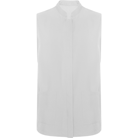 Kvinders ærmeløs kjole. Central lukning med skjulte automatiske knapper. Mandarinkrave, sidesømme og brystpile. To påsyede forlommer.