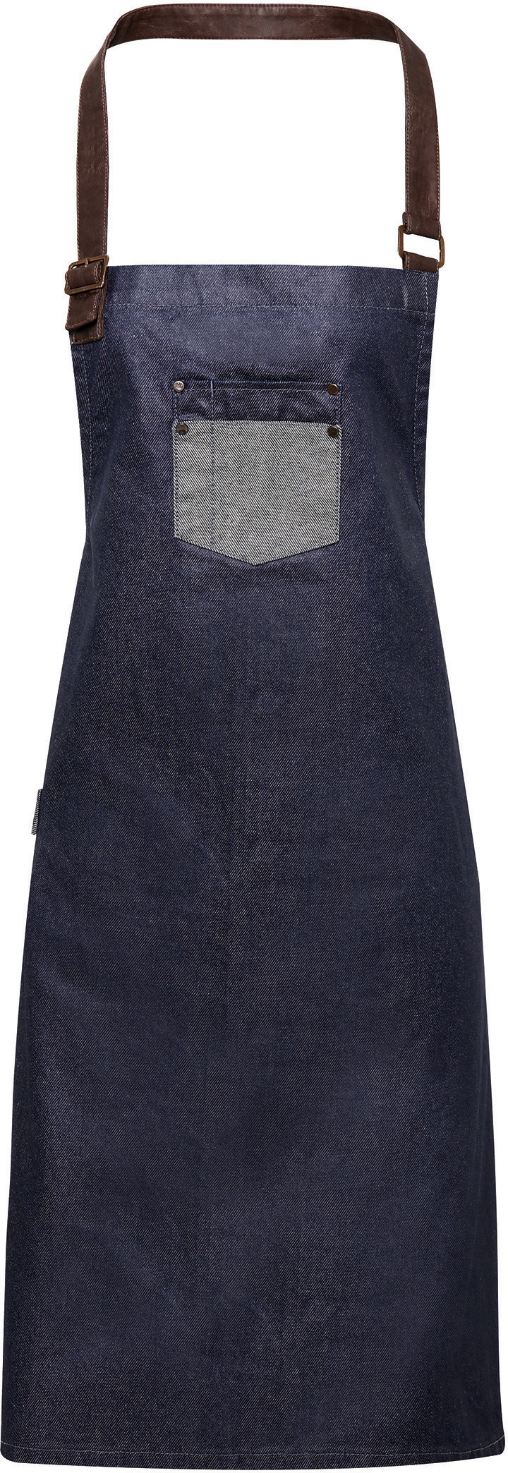 100% bomuld denim med en langvarig "olieret effekt" akryl finish. Farvet denim-effekt på grund af kontrasten af farvet garn. Smækforklæde i vintage stil med kontrasterende bærestykker og imiteret læderdetaljer for et autentisk og moderne look, meget brugt i mange virksomheder. Syntetisk læderrem. Justerbar nakkestrop med spænde. Mål: 86 cm x 72 cm. (Højde, bred). Holdbar og stærk. Snøre i nakke og talje i syntetisk læder. Akrylfinish med "olieret effekt", der giver et industrielt look.