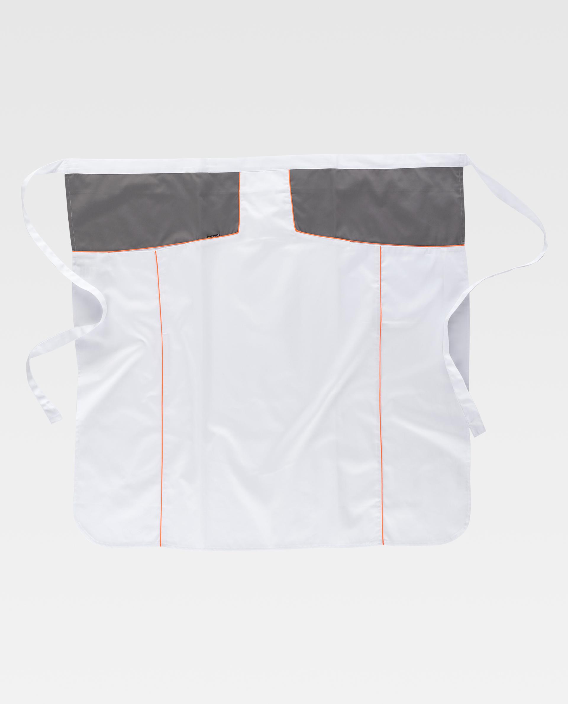 Kombineret ekstra langt fransk forklæde. To sidelommer med skrå åbninger og dekorative udskæringer toppet med synlige piping. Stropper til justering i taljen. Smudsafvisende finish. 85 x 90 cm. Kombineret ekstra langt fransk forklæde. To sidelommer med skrå åbninger og dekorative udskæringer toppet med synlige piping. Stropper til justering i taljen. Smudsafvisende finish. 85X90 cm.