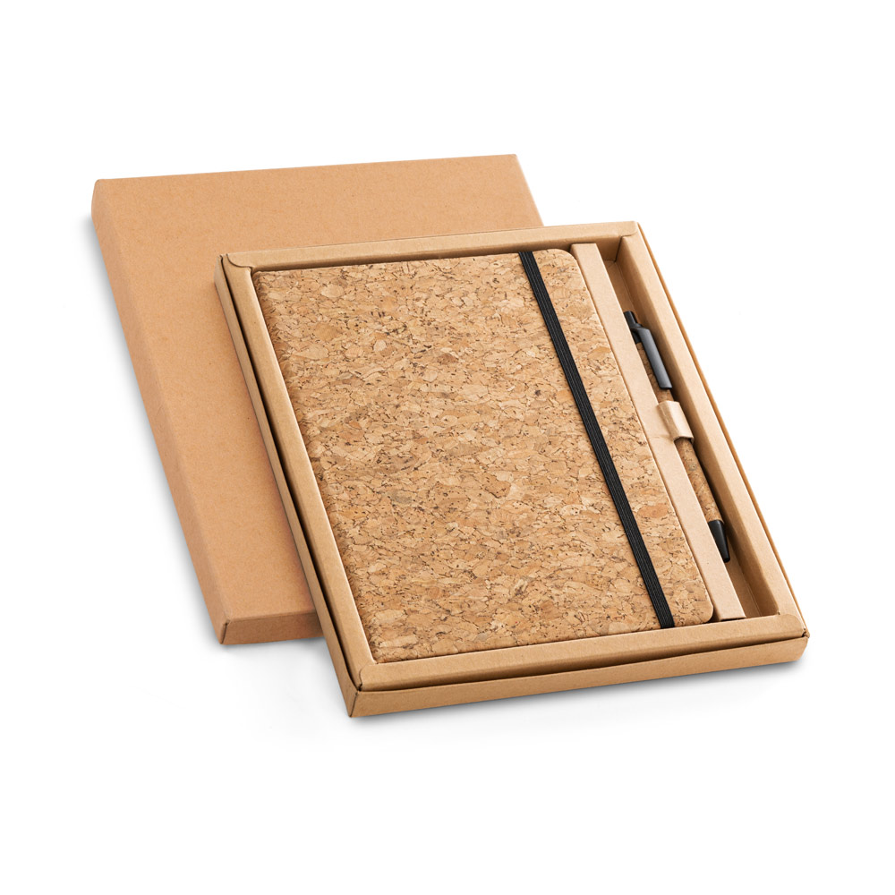 A5 notesblok og kork pen sæt. Notesbog med 192 linjer i elfenben farve. Blå skrivepen. Leveres i gaveæske i pap 140 x 210 mm