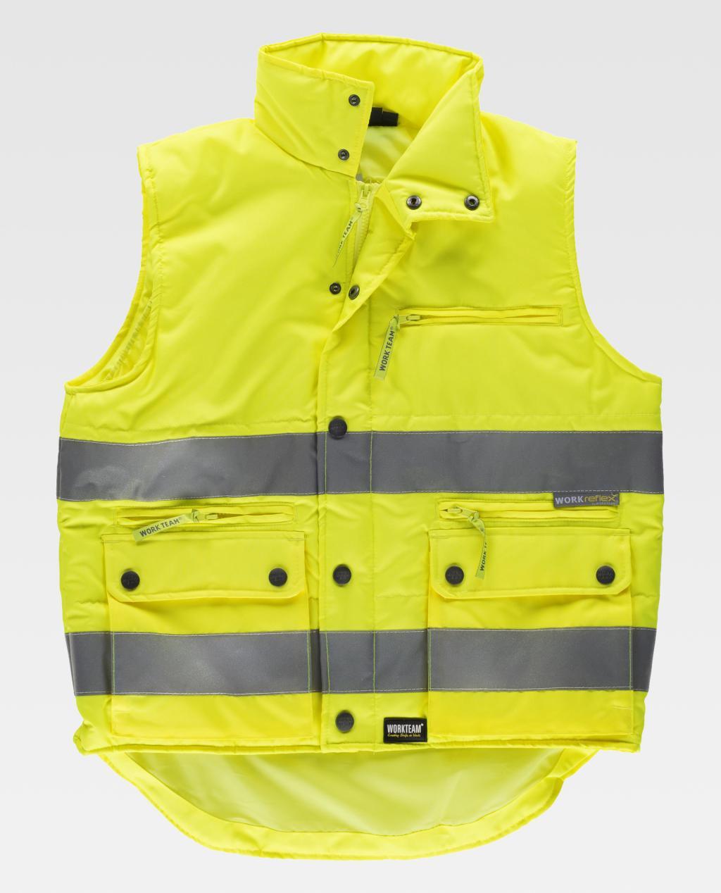 Højsyns-polstret vest i Oxford-stof med reflekterende tape. Opretstående krave og nylonlynlås skjult af en krog-og-øje klap. En brysttaske og to indvendige sider med lynlåslukning. To tasker med bælg og en portfolio med beslag på siderne. En patchet brysttaske med velcrolukning indeni. To refleksstriber på bryst og ryg. Justerbare ærmegab. Elastik i siderne af taljen. Højsyns-polstret vest i Oxford-stof med reflekterende tape. Opretstående krave og nylonlynlås skjult af en krog-og-øje klap. En brysttaske og to indvendige sider med lynlåslukning. To tasker med bælg og en portfolio med beslag på siderne. En patchet brysttaske med velcrolukning indeni. To refleksstriber på bryst og ryg. Justerbare ærmegab. Elastik på siderne af taljen.