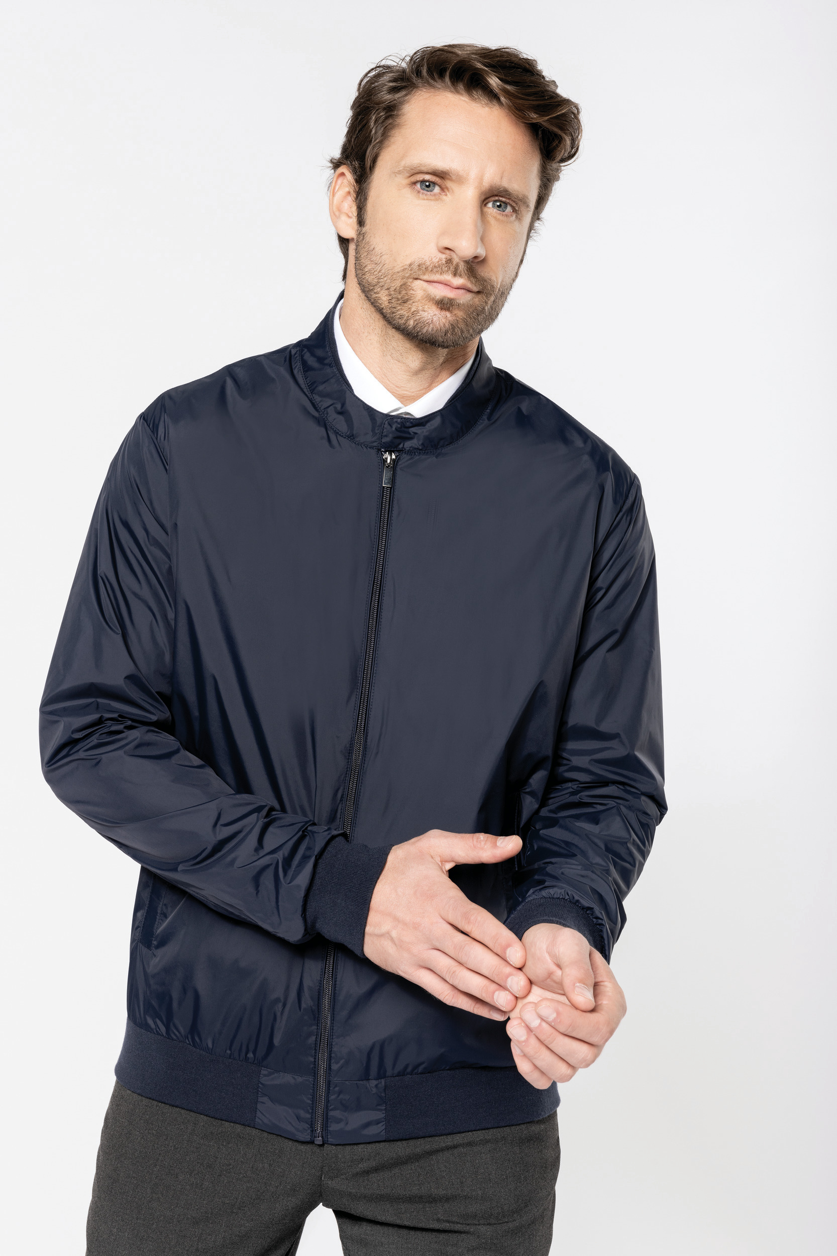 100% polyamid. Metallynlås og trykknapper i nakken. Sidelommer med trykknapper. Dobbelt krave med indvendig krave i 1x1 Rib, 1x1 Rib-tilsluttede ærmer og jakkekant (97% polyester/3% elastan). Løkke inde i halsen for at hænge jakken op. De indvendige sømme på ærmerne og ærmegabet er bundet for en god finish. Flæsende inderfor på den øvre ryg med patch for nem tilpasning. Indvendig tilpasningslynlås på brystet. Intet mærkemærke, kun et størrelsesmærke for nem tilpasning. Let herrejakke med en urban og uformel stil. Dens dobbelte krave giver den stil og større varme.