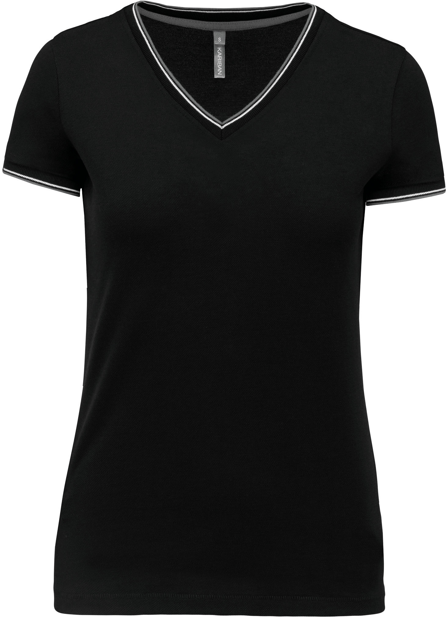 100% kæmmet bomulds piqué (Oxford Grey: 90% bomuld / 10% viskose). Ribkant med kontraststriber i halsudskæringen og ærmerne. Kontrasterende tape på halsen og sideslidser. Afsluttet med dobbeltsyning i bunden af tøjet. STANDARD 100 certifikat af OEKO-TEX® nr. CQ 1007/7, IFTH. En smart klassiker af kvinders garderobe. Kontrasterende ribstriber ved halsudskæring og nederst på ærmerne. Fremstillet af 100% kæmmet bomulds piquestrik.