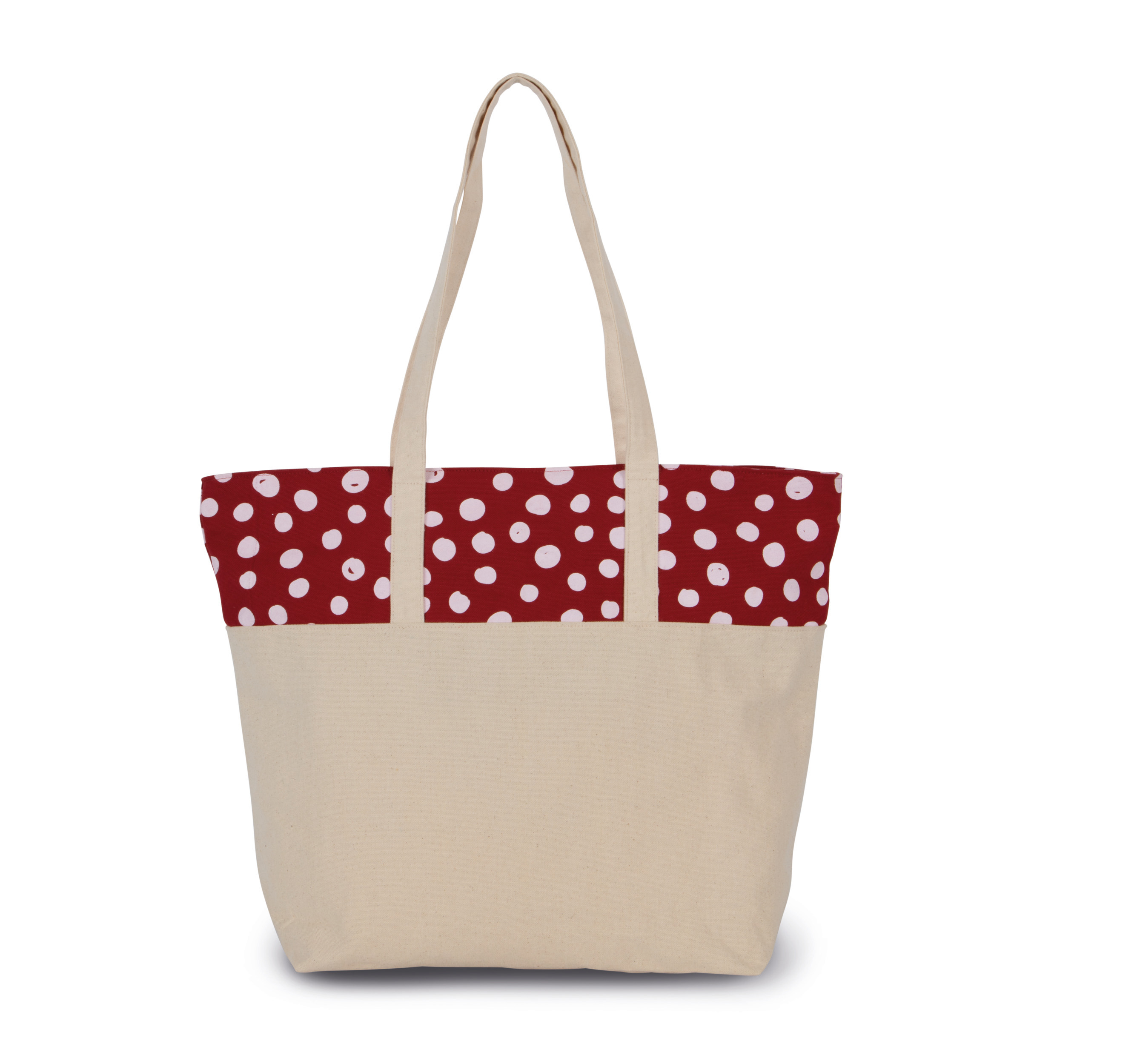 100% bomuld. Stor indkøbstaske i canvas bomuld. Farveprintet prikket motiv. Bomuldshåndtag i samme materiale som tasken Indvendig lomme. Lynlås lukning. Bevidst kollektion: naturlige og miljøvenlige materialer. Smukt trykt prikket motiv i farver som stilelement. Indvendig lomme til opbevaring af vigtige ting.