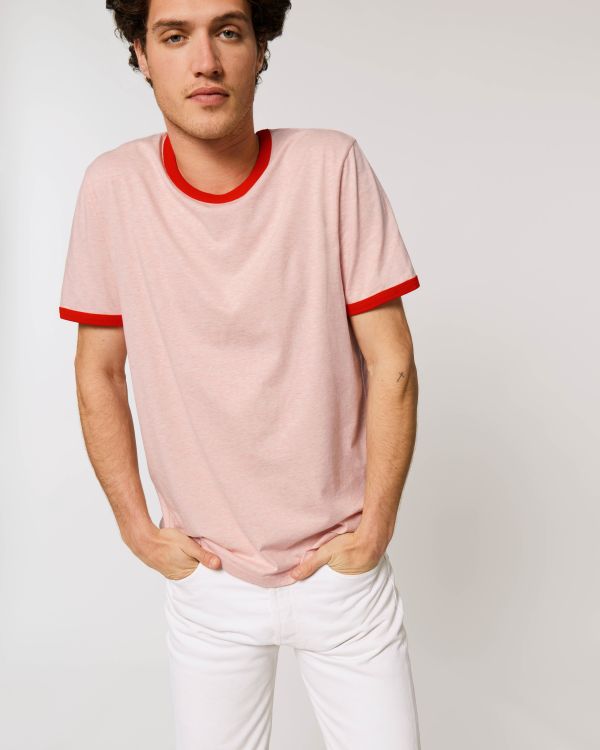 Den unisex t-shirt med kontrastkanter. Figursyet snit, rund hals, kortærmet, enkelt jersey strik. Lukket ærme Kontrasterende 1x1 ribkrave og manchetter med dobbeltsyning Dobbeltsyning på sømmen