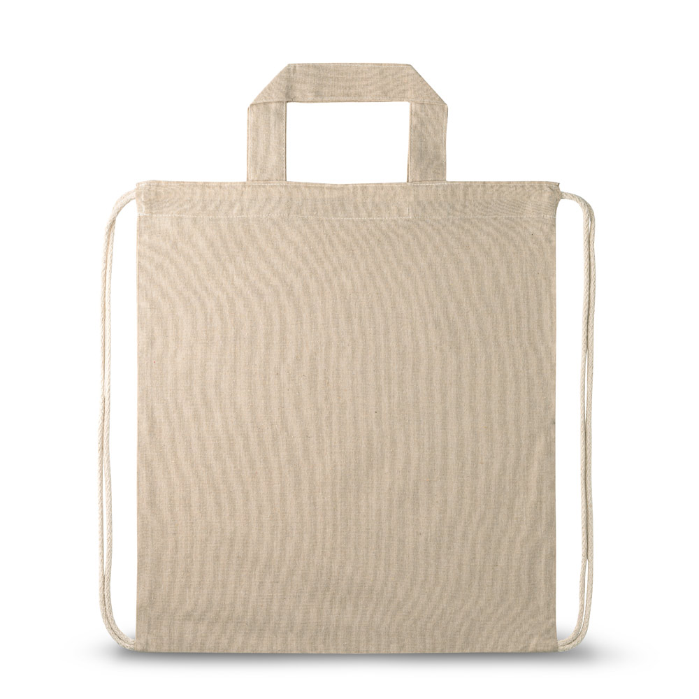 Genanvendt bomuldsrygsæk (140 g/m²), med 30 cm håndtag og bomuldssnørelukning.370 x 410 mm