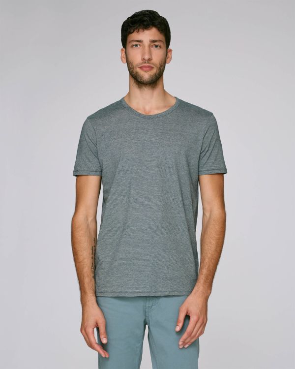 T-shirten til ham tynde striber. Normal pasform, rund hals, korte ærmer, garnfarvet single jersey strik. Lukket ærme Krave med bias i hovedstoffet og dobbeltsyning Blindsøm på manchetter og søm
