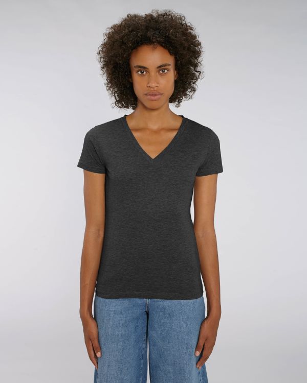T-shirten med V-hals til hende. Regular fit, V-hals, Kortærmet, Single jersey strik. Påsyet ærme