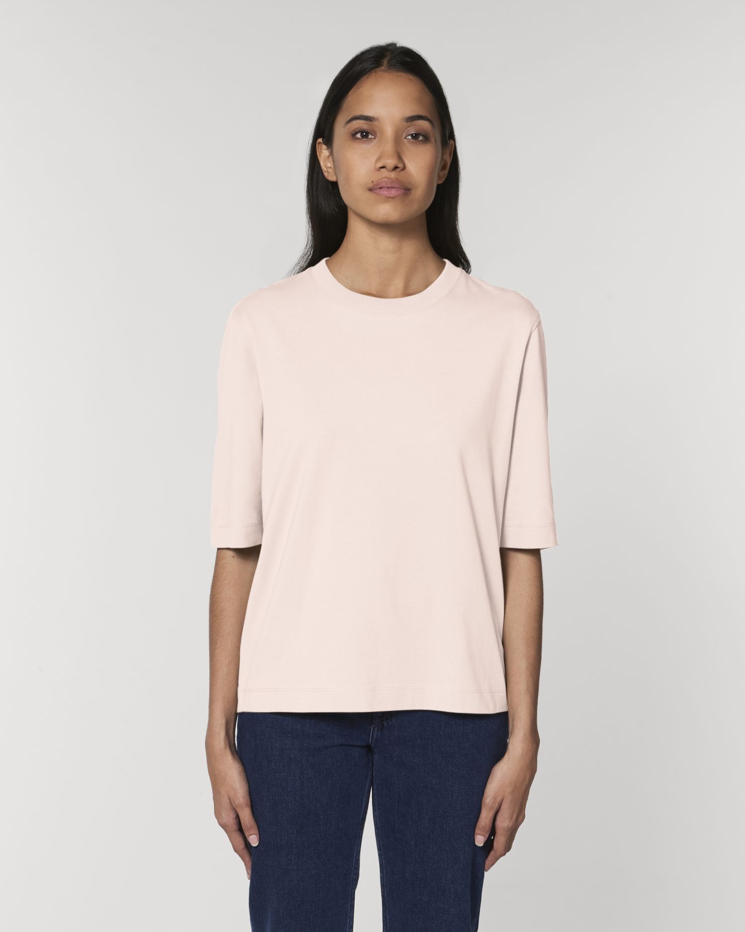 Den tykke, æske t-shirt til hende. Løs pasform, Rund hals, Kortærmet, Single jersey strik. Tilskårne ærmer