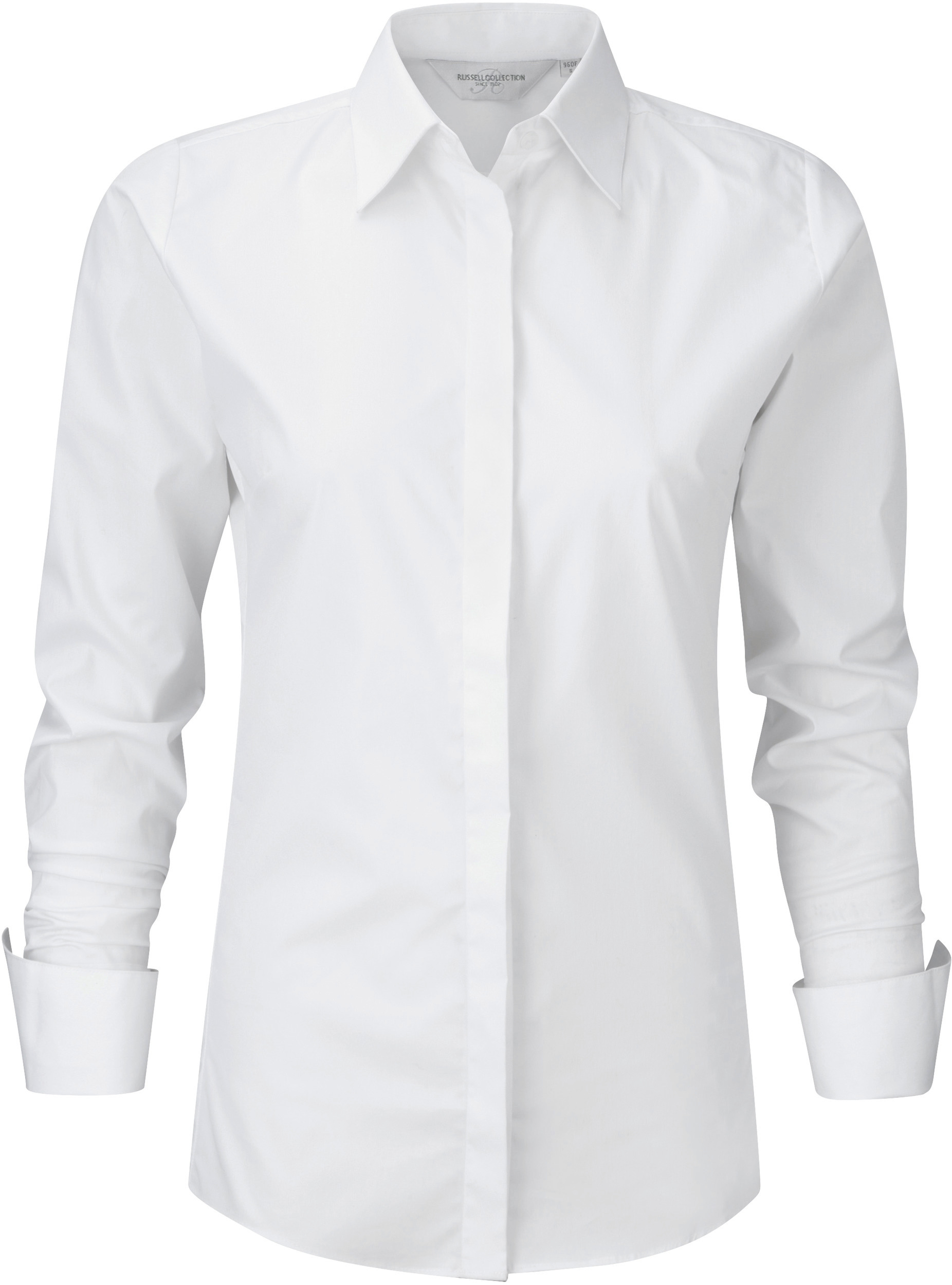 75% bomuld / 25% elastomultiester (Lycra® T400 fiber). Denne nye fiber giver komfort, elasticitet, modstand og fugtstyring. Moderne hals. Skjult knaplomme. Prinsesse paneler uden sidesømme. Klemme på bagsiden. Napolitanske manchetter. Slim pasform. STANDARD 100 certifikat af OEKO-TEX®N° 08-5941, Shirley. Holdbarhed og stabilitet. Fugtstyring: friskhed og komfort. Behageligt og blødt stof.
